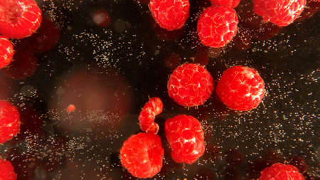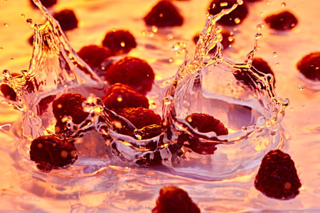 dynamic splash of raspberry hitting water, with scattered berries in background, all bathed in golden glow. Concept of summer, nutrition, diet, healthy, detox, refreshing.