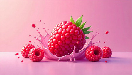 Vibrant raspberry surrounded by splashing juice on pink backdrop