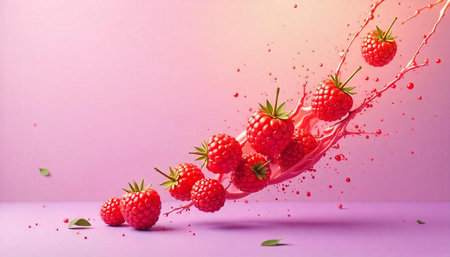 Vibrant raspberry explosion with splashing juice on orange backdrop