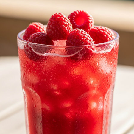 Brightly colored drinks filled with raspberries and ice create a cool refreshment for warm days.