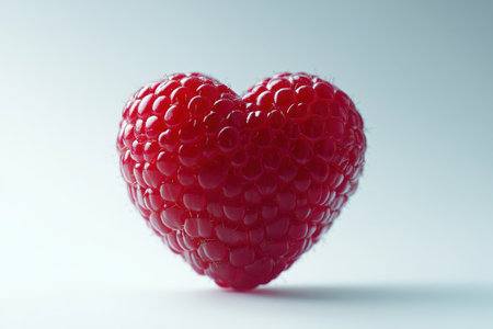 Heart-shaped raspberry displays its intricate texture against a soft, neutral background. The image highlights the vibrant red hue and detailed surface of the fruit, symbolizing love and nature
