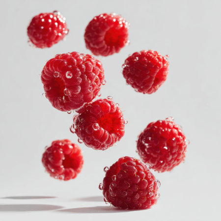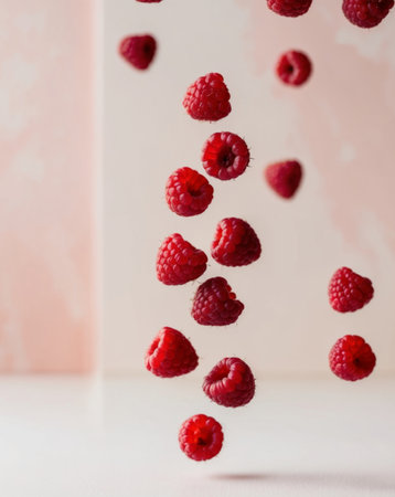 Raspberries float in mid-air, captured in a modern design setting with a light background.