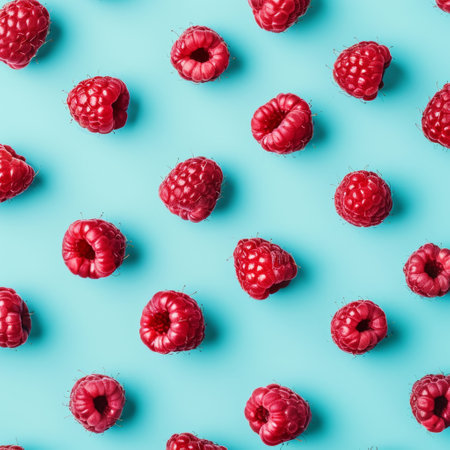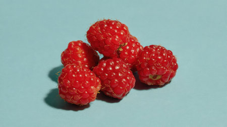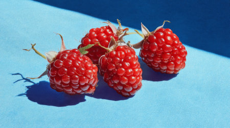 A beautiful display of fresh red raspberries resting on a blue surface, capturing natural light and creating engaging shadows. Perfect for food lovers!