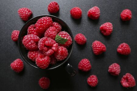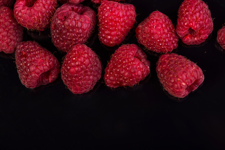 A heap of wonderful delicious raspberry lying on the black vitreous surface