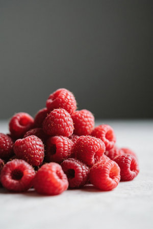 A Fresh raspberries arranged in minimalistic style on light background