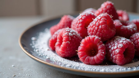 Vibrant raspberries on plate with powdered sugar