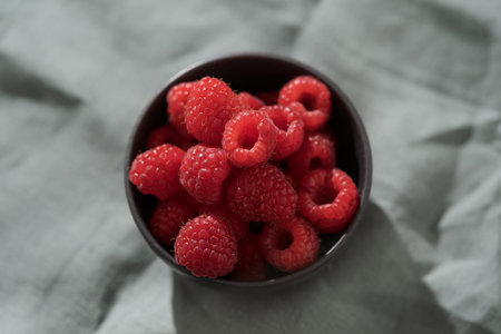 Fresh top view of red raspberries in high quality image with ample space for versatile usage