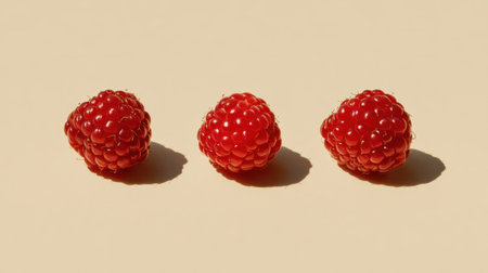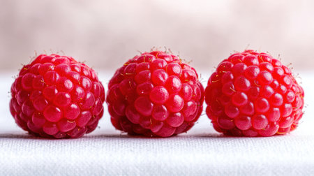 Three fresh red raspberries arranged on a soft light background, highlighting their juicy texture and vibrant color, perfect for food photography projects.