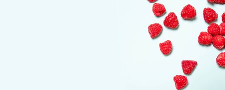 Top view of fresh juicy raspberry berries on a blue background with copyspace