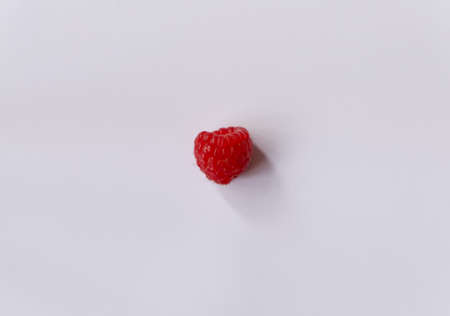 Single red raspberry on white background with space for copy