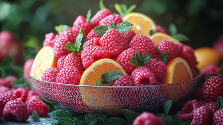 A bright and colorful bowl filled with fresh raspberries, orange slices, and mint leaves arranged for a summery vibe.