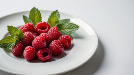 AI Generated. Fresh Raspberries with Mint on a White Plate
