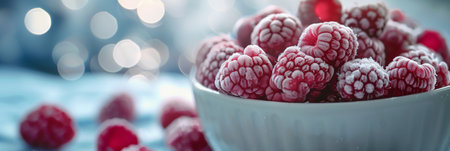 A bowl of frozen raspberries sits on a table. The raspberries are white and red, and they are surrounded by a blue background. The bowl is the main focus of the image