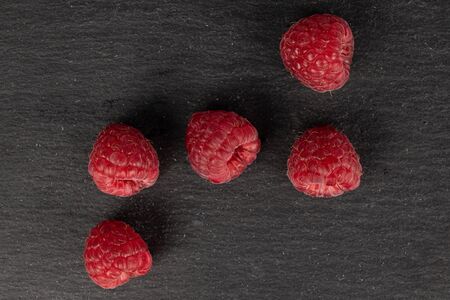 Group of five whole fresh red raspberry flatlay on grey stone