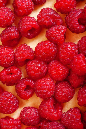 Background of raspberries lying on Shortcake dough, top view close up.