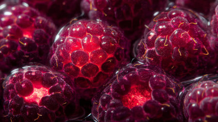 This close-up image features juicy, ripe raspberries showcasing their vibrant red color and textured surface, perfect for culinary projects and fresh fruit illustrations.