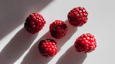 This image captures fresh raspberries arranged artistically on a light surface, highlighting their rich red hue and unique texture while casting intriguing shadows.