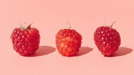 This image features three fresh red raspberries on a soft pink background. The arrangement showcases the vibrant colors and textures, perfect for food-related themes.