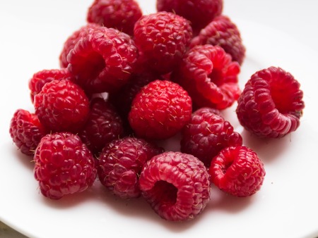 Fresh ripe raspberries on a white saucer
