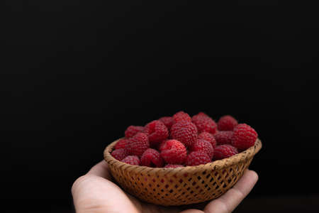 hand holds a black plate with raspberries. Delicious and Healthy Food