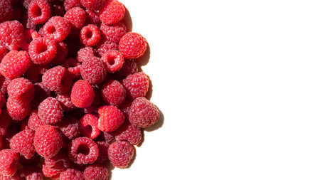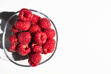 Fresh and ripe raspberries on a white background with copy space