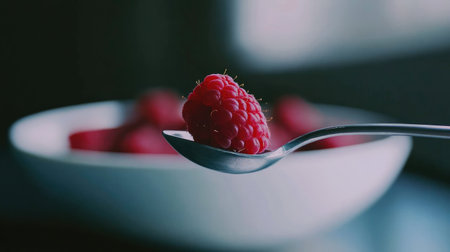 A closeup image featuring a fresh raspberry resting on a spoon, with a bowl of raspberries in the background. This vibrant shot captures the essence of healthy eating and delicious snacks.