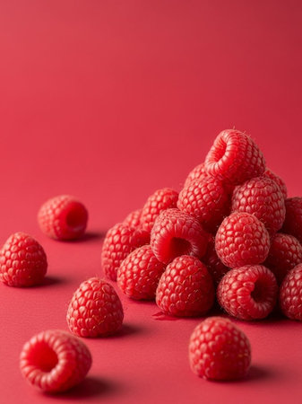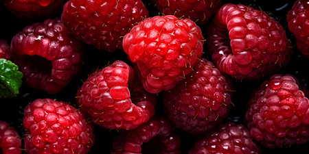 Close up view of fresh raspberries showcasing vibrant red color and rich texture, perfect for healthy eating and food photography