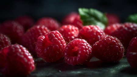 An AI generated illustration of fresh, ripe raspberries on a dark black table