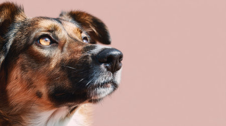 Happy healthy dog looks up in soft natural light, creating a feeling of care and trust against a clean pastel background with empty space for text.