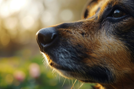 Closeup of a dog's nose with a blurred spring landscape in the background. Cute pet. Generative AI illustration