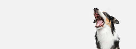 Lovely dog close up portrait posing outdoors with a funny emotion, showing his long tongue and a smiley face. Overjoyed border collie puppy enjoy the cold winter morning in the nature.
