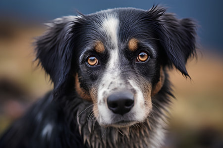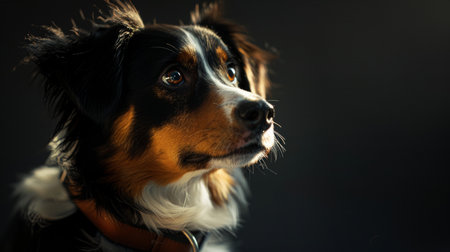 Portrait of a black and white Australian Shepherd dog. Selective focus.