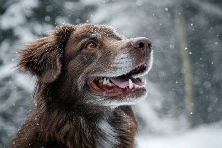 A cheerful brown dog stands in the snow-capped forest, with fluffy fur covered in snowflakes. The dogs expression shows happiness as it enjoys the winter day.