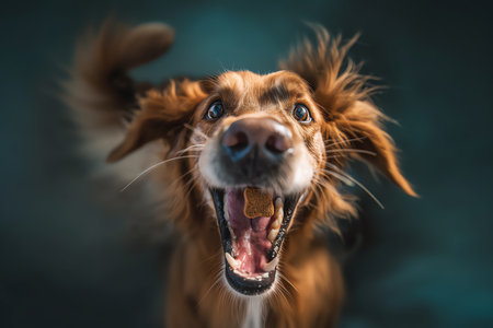This vibrant and captivating image showcases an Australian Shepherd dog in a state of pure excitement and joy The dog s mouth is open tongue hanging out and its eyes are sparkling with an animated