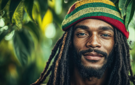 Confident young man wearing rasta beanie with dreadlocks and neutral expression