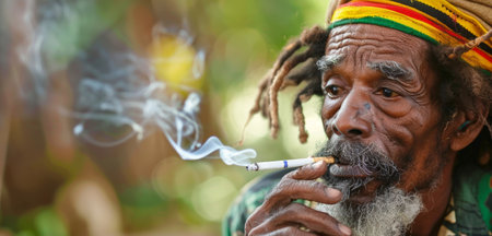 The serene gaze of a Rastafarian elder, his smoke curling into the air as he sits enveloped by the tranquility of nature