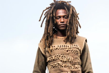 A man with long dreadlocks and colorful attire stands confidently amidst vibrant foliage, showcasing his unique style and cultural heritage.