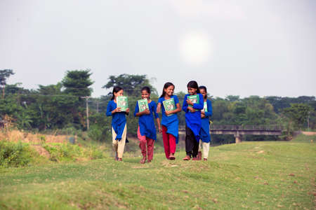 Gowainghat, Bangladesh – November 06, 2019: Children with school uniforms walking on the green grass road to attend to the school. Young girls with textbooks on their chest enjoying going to school with smile on the face.
