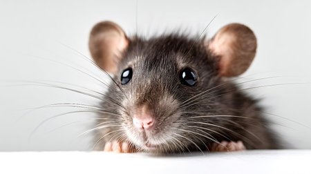 Adorable pet rat with dark fur, long whiskers, and large black eyes peeking over a white surface, showing curiosity and intelligence in a detailed studio portrait