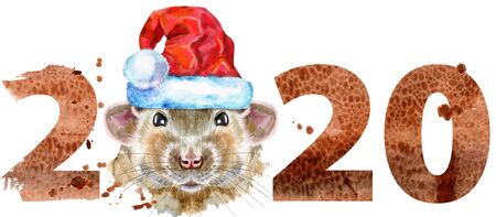 Cute rat for t-shirt graphics. Watercolor rat in Santa hat illustration with year 2020