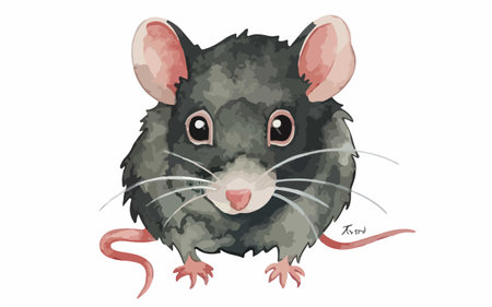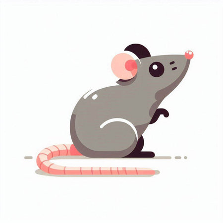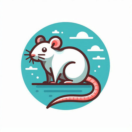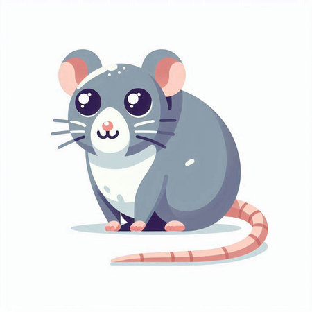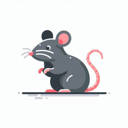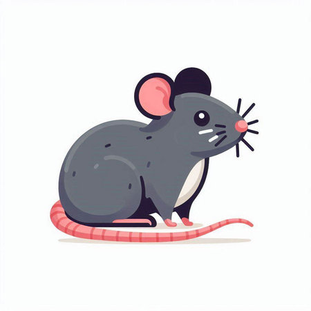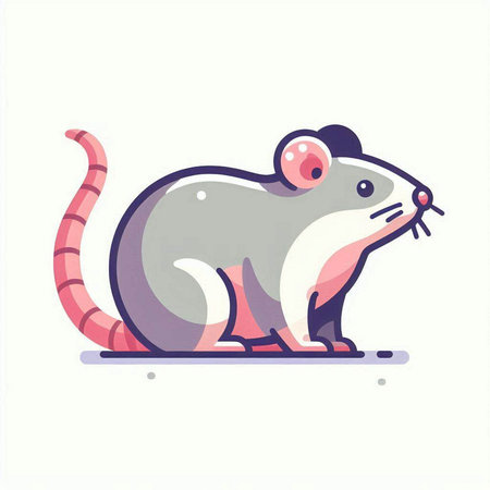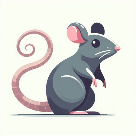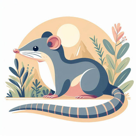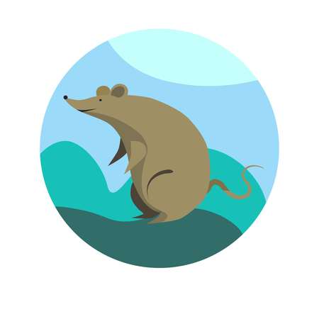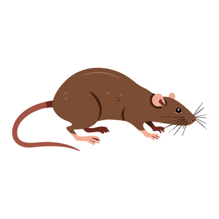 Illustration shows a brown rat in side view with long tail and whiskers in simple flat style, presenting natural animal posture calm mood.