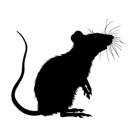 This artistic silhouette of a rat showcases distinct features such as fur, ears, and whiskers. Ideal for projects related to animals or pest control.