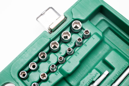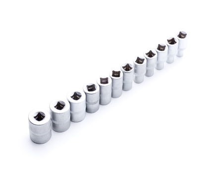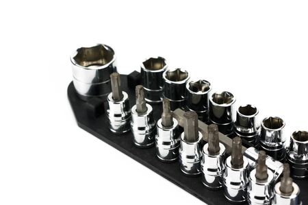Set of metallic socket and bit set isolated on white background.