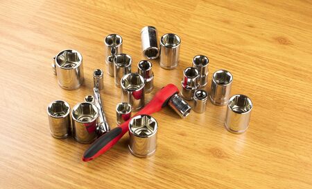 Socket wrench with ratchet and different nozzles on wooden background, close-up macro