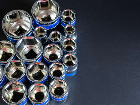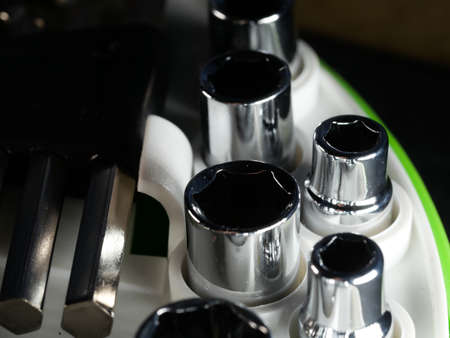 Photo of heads for unscrewing nuts and bolts of different diameters. car repair tool kit.