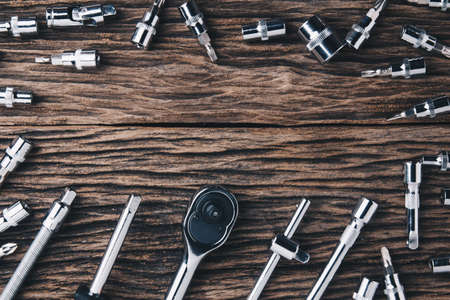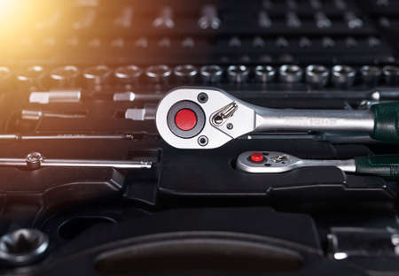 Closeup of metal socket ratchet handle. Industrial steel tool, close up over toolbox.