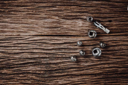 A car parts and wrenches on the workbench background with copy space.