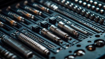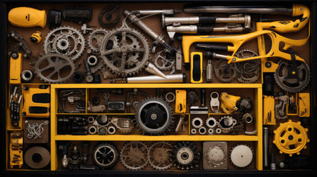 Assorted mechanical parts and gears neatly arranged on a dark background