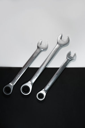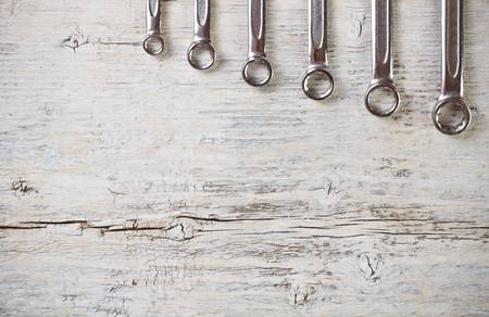 Wrench spanners tools on wood background