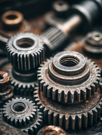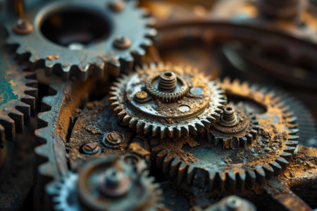 Intricate, aged metallic machinery with weathered cogs and components revealing textures of corrosion and history, perfect for industrial or steampunk themes